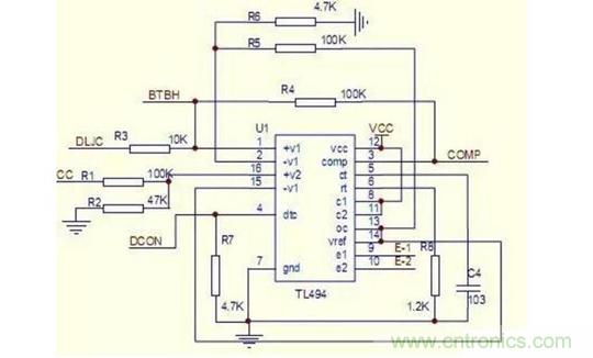(1)腳第一組放大器的同相輸入端,檢測輸出電流,與3個0.33R 電阻分壓,當電流過大時,分壓電阻上的電壓超過(2)腳基準電壓,(3)腳放大器輸出端輸出高電平,(3)腳為高電平時,電路進入保護狀態。(2)腳為比較器的反相輸入端,接(14)腳基準,作比較器的參考電壓,外部輸入端的控制信號可輸入至腳(4)的截止時間控制端(也叫死區時間控制),與腳(1)、(2)、(15)、(16)誤差放大器的輸入端,其輸入端點的抵補電壓為120mV,其可限制輸出截止時間至最小值,大約為最初鋸齒波周期時間的4%。當13腳的輸出模控制端接地時,可獲得96%最大工作周期,而當(13)腳接制參考電壓時,可獲得48%最大工作周期。如果我們在第4腳截止時間控制輸入端設定一個固定電壓,其范圍由0V至3.3V之間,則附加的截止時間一定出現在輸出上。 (5)、(6)腳是一個固定頻率的脈沖寬度調制電路,內置了線性鋸齒波振蕩器,振蕩頻率可通過外部的一個電阻和一個電容進行調節,其振蕩頻率如下: