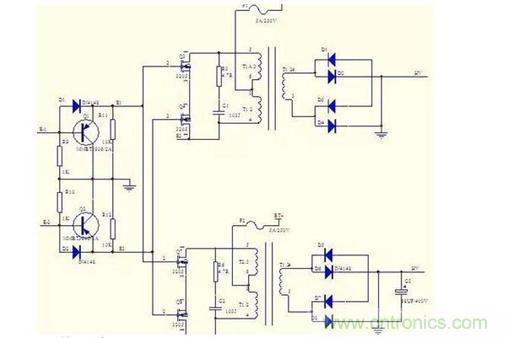 這是一個推挽式拓撲逆變電路,當E1驅動脈沖驅動時,Q1導通,使VT3、VT6導通,VT7、VT8截止,此時電路進行正半周波形放大,變壓器升壓到次級,通過高頻整流管整流,當E2脈沖驅動時,Q2導通,驅動VT7、VT8導通。VT3、VT6截止,進得負半周波形放大。經升壓變壓器升壓后,高頻整流。
