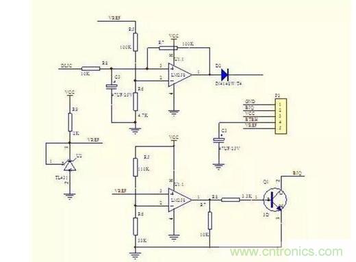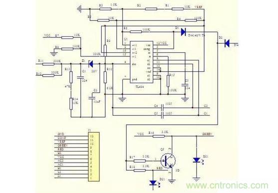 電路中采用雙運放比較放大器LM358來控制輸出過流保護,輸出電壓過低保護電路,TL431在此設制2.5V基準電壓,給比較器同相輸入端作參考電壓,第一組運放的同相輸入端接輸出電流檢測,反相輸入端接參考電壓,當電流過大,比較器輸入電壓升高,當超過2.5V時,輸出端輸出高電平,送入IC1的3腳,IC關閉輸出。第二組運放同相輸入端接參考電壓,反相輸入端接輸出電壓,當電壓過低,檢測分壓后電壓低于2.5V時,輸出端輸出高電平,Q1導通,蜂鳴器報警。