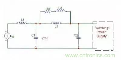 這是用的最多的一種,如圖,通常都僅僅在電感上并聯一個阻尼電阻,這個阻尼電阻不可少,曾經看到有些貼問這個電阻干什么用,有各種說法,但很少有說對的,請記住這個是阻尼電阻,為了消除干擾信號在濾波器的截止頻率處產生尖峰,達到243樓的的幅頻特性的加阻尼后的效果。有人說前面一個C1電容可以省去,這個說法不對的,我們前面已講過,每加一個儲能元件 L 或 C,濾波器的階數并升高一階,對信號的衰減可以增加20dB/十倍頻程,pi 濾波器是三級濾波器,把C1拿掉后變成了二階,濾波效果會打折扣。