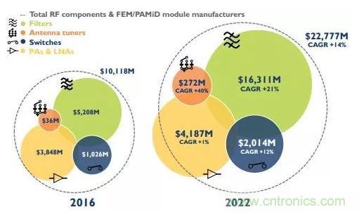 數據來源:《手機射頻前端模塊和組件-2017版》