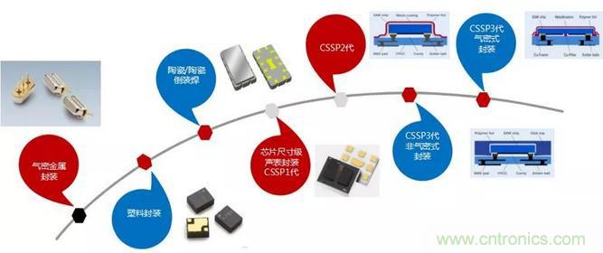 SAW器件封裝要求:(1)器件有源表面必須有一定空間;(2)襯底和封裝材料必須有良好的熱匹配;(3)防止濕氣浸人和微粒沾污。先后經歷過氣密金屬封裝、塑料封裝、陶瓷封裝、陶瓷倒裝焊、芯片尺寸級聲表封裝CSSP等幾個階段,針對不同的客戶需求和應用場景這些封裝方案依然共存,但是器件的小型化是大勢所趨。