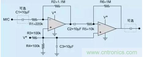如果麥克風的輸出電平較低,工程師必須注意選用低噪聲的運算放大器。如性能較好的低噪聲運算放大器應該產生較低的輸入參照電壓噪聲,而且噪聲不應超過10nV/((Hz)。
