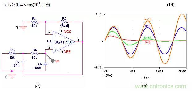 ● 將k提高到2以上,使運算放大器注入的能量超過端口電阻可以消耗的能量,引起發散振蕩,如圖9b中k=2.1所示。振蕩將持續增長到運算放大器飽和為止。
