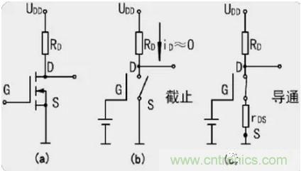 uGS>開啟電壓UT:MOS管工作在導(dǎo)通區(qū),漏源電流iDS=UDD/(RD+rDS)。其中,rDS為MOS管導(dǎo)通時的漏源電阻。輸出電壓UDS=UDD·rDS/(RD+rDS),如果rDS《RD,則uDS≈0V,MOS管處于“接通”狀態(tài),其等效電路如上圖(c)所示。
