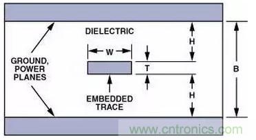 帶狀控制阻抗印制線(參見圖14)采用了兩層接地平面,信號印制線夾在其中。這種方法使用了較多的印制線,需要的PCB層數(shù)更多,對電介質(zhì)厚度變化敏感,而且成本更高——所以通常只用于要求嚴格的應(yīng)用中。