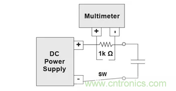下面是通過使用電阻和內(nèi)阻阻抗較高的萬用表來測量超級電容漏電流的步驟,以測試電路圖: