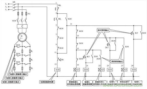 轉(zhuǎn)子回路中的3組啟動電阻,由接觸器2KM、3KM、4KM在時(shí)間繼電器1KT、2KT、KT3的控制下被順序短接;在正常工作時(shí),只有接觸器1KM和2KM的主觸點(diǎn)閉合。