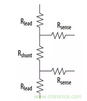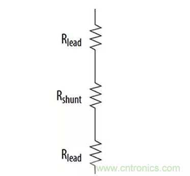 分流電阻器并不像其外表看起來(lái)那么簡(jiǎn)單。具體而言,分流電阻器的電阻實(shí)際上由三個(gè)電阻組成(圖2)。首先,分流電阻器本身有電阻。其次,分流電阻器引線和分流電阻器連接的印刷電路板上的引線也有電阻。通常這些引線電阻不明顯,但是分流電阻器的電阻值通常非常低。在高電流測(cè)量中,即使很小的引線電阻也會(huì)引入測(cè)量誤差,因?yàn)橹圃焐痰姆至麟娮杵麟娮枰?guī)格中并未考慮這些電阻。