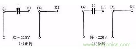 圖4是JX07A-4型單相電容運轉電動機接線方法。電動機功率為60W,用220V/50Hz交流電源、電流為0.5A。它的轉速為每分鐘1400轉。電容選用耐壓400~500V、容量8μF的產品。圖4(a)為正轉接線,圖4(b)為反轉接線。