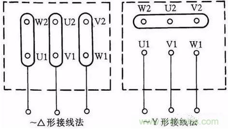 圖1:三相交流電動機Y形和△形接線方法