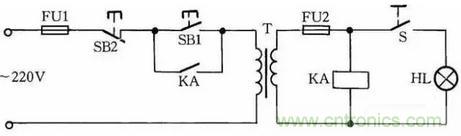 工作原理:閉合S后,按下按鈕SB1,變壓器得電輸出36V低電壓,使得繼電器或交流接觸器KA吸合。放松按鈕SB1后,KA自鎖觸點使KA保持吸合,繼續給變壓器接通電源。如果變壓器次級發生短路故障,繼電器線圈電壓為零,此時KA便失電釋放,將變壓器電源斷開,保護變壓器不被破壞。