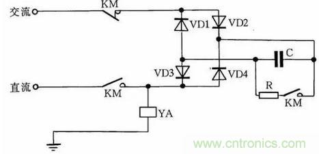 直流電磁鐵停電后,因有剩磁存在,有時會造成不良后果。因此,必須設法消除剩磁。圖9中,YA是直流電磁鐵線圈,KM是控制YA啟停的接觸器。KM吸合時,YA通電勵磁;KM復位時,YA斷直流電,并進行快速退磁。