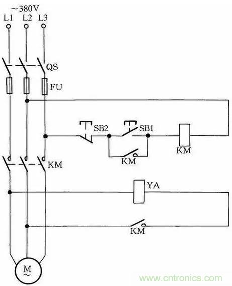 圖中SB2為停止按鈕,在停止時,按動SB2的時間要長一點。否則,手松開按鈕后,接觸器又吸合,使電動機繼續運行。這是因為電源電壓雖被切斷,但由于慣性的作用,電動機轉子仍然轉動,其定子繞組會產生感應電動勢,一旦停止按鈕很快復位,感應電動勢直接加在接觸器線圈上,使其再次吸合,電動機繼續運轉。
