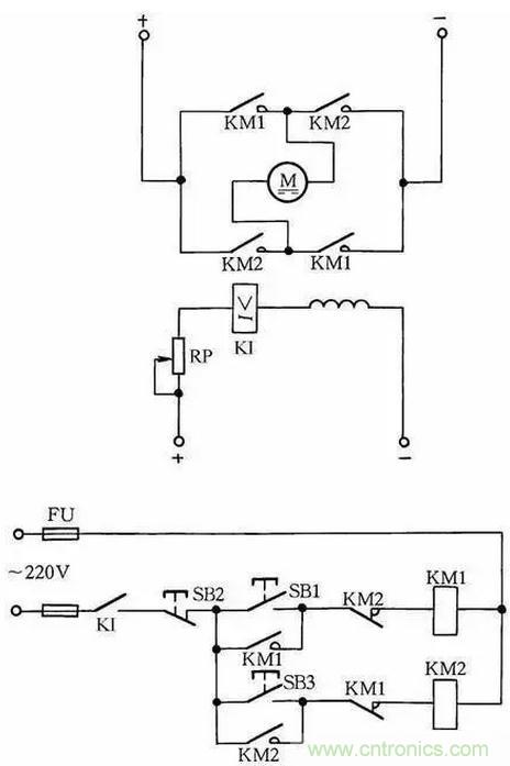 在勵磁電路內,串聯一個欠電流繼電器KI,其常開觸點接在控制電路中。當勵磁電流消失或減小到設定值時,KI釋放,KI常開觸點斷開,切斷電動機電樞電源,使電動機停轉,從而避免超速現象發生,見圖11。