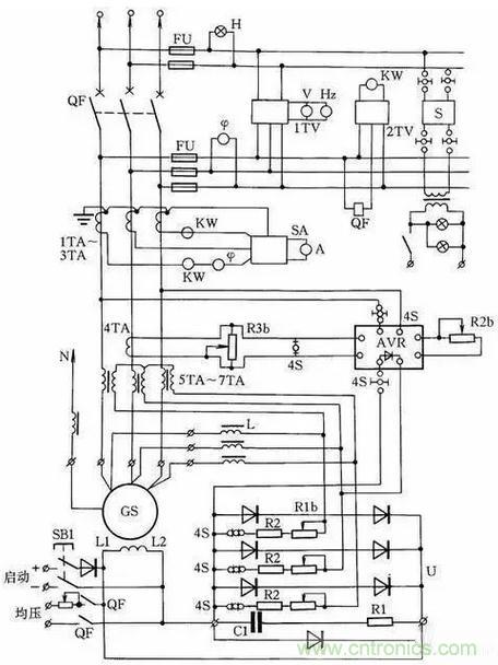 HF-4-81系列發電機控制線路如圖15所示,它與T2XV系列小型三相同步發電機配套。同步發電機的勵磁系統采用電復合相復勵調壓。發電機端電壓經線性電抗器L移相,然后與發電機負荷電路中的電流互感器5TA~7TA二次電壓合成,經三相橋式整流器整流后,供發電機GS勵磁自動調壓。