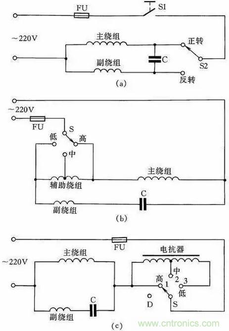 圖16(c)為帶電抗器調速的電容電動機接線線路。由于電抗器繞組(其在線路中起到降壓作用)的串入,調節電抗器繞組的串入量,即可改變轉速。這種方法目前廣泛應用在家用電風扇線路中。在啟動電動機時一般先撥到“1”擋上,即為高擋,這時電抗器不接入線路,使電動機在全壓下啟動,然后再撥“2”擋或任何擋來調節電動機轉速。
