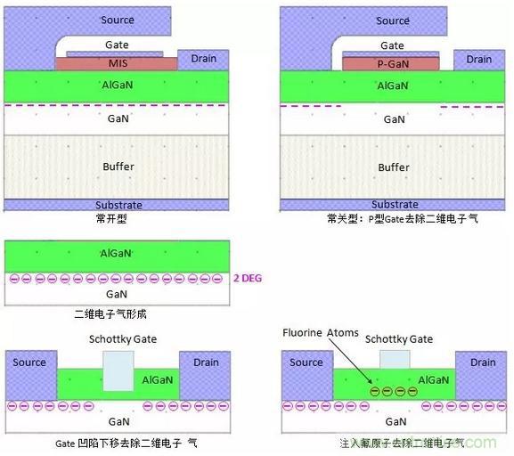 2、GaN和AlGaN異質(zhì)結(jié)內(nèi)在的產(chǎn)生導(dǎo)電的二維電子氣,常開型GaN器件通常稱為耗盡型GaN功率晶體管,必須在Gate加上反壓,才能將Gate下面AlGaN層中的二維電子氣去除,從而將器件關(guān)斷。這種常開型器件在應(yīng)用中會(huì)產(chǎn)生許多問題,因此不太適合實(shí)際的應(yīng)用。