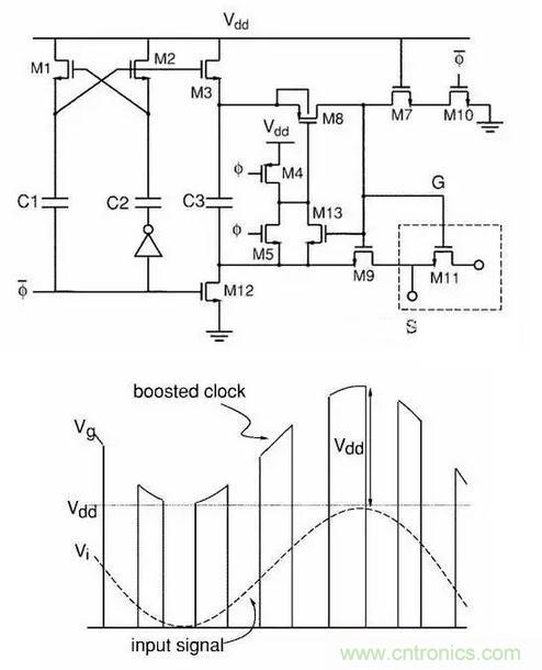 電路用在各種ADC之前的Sample電路,可以讓ADC實現rail to rail的input,sample電路的工作電壓超過Vdd,極大的減少了了setting time,而且幾乎沒有reliability的問題。電路里沒有任何一個器件是可以被減少或者改變位置的。此電路直接使得ADC的發展往前躍進了一大步,現在已經幾乎成為除ΔΣ之外各種ADC的標配,成為歷史上最經典的模擬電路之一。當然,電路原理一眼看去也不是很好理解。