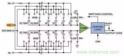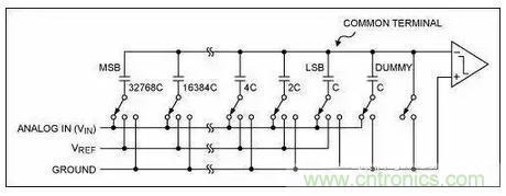 每個時鐘沿,比較器對電容上的電壓和地作比較, 由此結果來決定下一個電容是否接入電路。