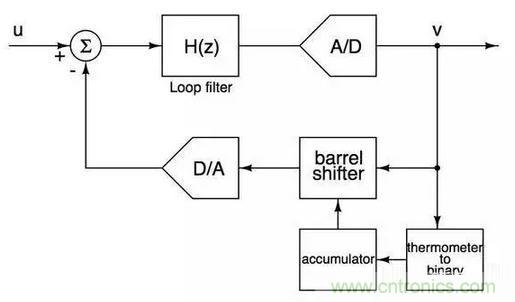 基本思想是快速遍歷DAC中的每一個電流元從而減少電流元mismatch對ADC信噪比的影響,僅僅通過幾個簡單的數電模塊就實現對電流元mismatch的first order noise shaping,非常巧妙。