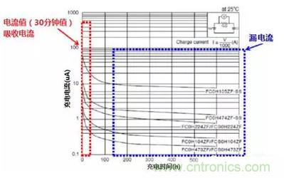 圖1中顯示了KEMET公司“FC系列”產品在室溫下的漏電流特性和測量電路。當超級電容器充電時,存在穩定的寄生電流(Parasitic Current)。超級電容器通過離子“吸收”和“釋放”造成充電,并且當離子試圖到達活性炭的細孔內部時,充電開始時的寄生電流很高。該初始電流稱為“吸收電流”。該充電電流隨著時間的推移而減小,并且隨著時間的推移變得穩定。在開始施加電壓30分鐘后的主電流分量是吸收電流。當吸收電流減小時,漏電流成為主要成分。