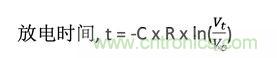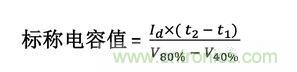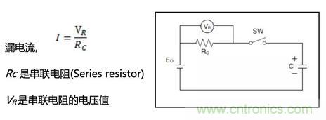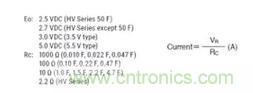 除了部份生產商直接提供參數值外,“漏電流值”可通過向超級電容器施加電壓直至特定時間后測量電阻器兩端的電壓,再根據以下簡單方程計算便能得出。