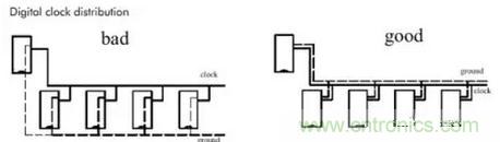 對應地線回路規(guī)則,實際上也是為了盡量減小信號的回路面積,多見于一些比較重要的信號,如時鐘信號,同步信號;對一些特別重要,頻率特別高的信號,應該考慮采用銅軸電纜屏蔽結構設計,即將所布的線上下左右用地線隔離,而且還要考慮好如何有效的讓屏蔽地與實際地平面有效結合。