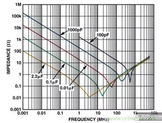 并聯(lián)不同電容值的電容器有助于確保電源引腳在很寬的頻帶上出現(xiàn)很低的交流(AC)阻抗。這對(duì)于在運(yùn)算放大器電源抑制比(PSR)衰減頻率處尤其重要。該電容器有助于補(bǔ)償放大器降低的PSR。在許多十倍頻程范圍內(nèi)保持低阻抗的接地通路將有助于確保有害的雜訊不能進(jìn)入運(yùn)算放大器。(圖一)顯示採用多個(gè)并聯(lián)電容器的優(yōu)點(diǎn)。在低頻段,大的電容器提供低阻抗的接地通路。但是一旦頻率達(dá)到了它們自身的諧振頻率,電容器的相容性就會(huì)減弱,并且逐漸呈現(xiàn)出電感性。這就是為什么採用多個(gè)電容器是很重要的原因:當(dāng)一個(gè)電容器的頻率回應(yīng)開始下降時(shí),另一個(gè)電容器的頻率回應(yīng)開始其作用,所以能在許多十倍頻程范圍內(nèi)保持很低的AC阻抗。