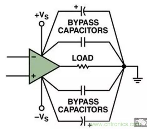 這種方法在大多數(shù)情況下都是最有效的,採用多個(gè)并聯(lián)電容器將運(yùn)算放大器的電源引腳直接接地。一般說來兩個(gè)并聯(lián)電容就足夠了,但是增加并聯(lián)電容器可能給某些電路帶來益處。