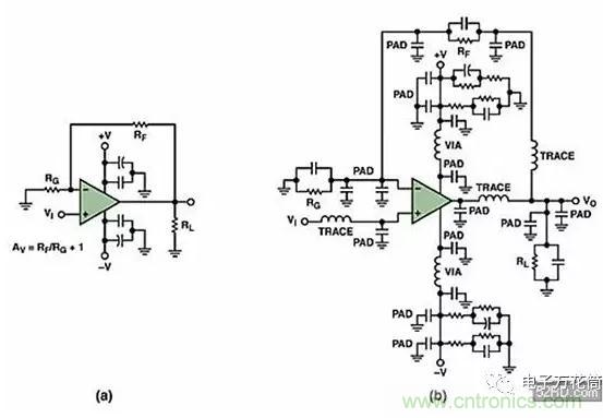 所謂寄生效應(yīng),按照字面意思就是那些出現(xiàn)在PCB板中并在電路中大施破壞、令人頭痛且原因不明的小故障。它們就是滲入高速電路中隱藏的寄生電容和寄生電感。其中包括由封裝引腳和印制線過長所形成的寄生電感;焊盤(pad)到地、焊盤到電源平面和焊盤到印制線之間形成的寄生電容;通孔之間的相互影響,以及許多其他可能的寄生效應(yīng)。(圖三)(a)顯示一個(gè)典型的同相運(yùn)算放大器原理圖。但是,如果考慮寄生效應(yīng)的話,同樣的電路可能會(huì)變成圖三(b)那樣。