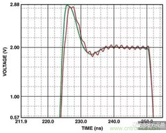 (圖七)中的震盪顯示高速運(yùn)算放大器同相輸入端長度為2.54cm的印制線的影響。其等效寄生電感為29nH(10-9H),足以造成持續(xù)的低壓振蕩,會(huì)持續(xù)到整個(gè)瞬態(tài)回應(yīng)周期。圖七還顯示了如何利用接地平面來減小寄生電感的影響。