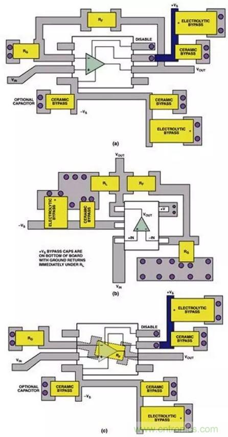 (圖九) 同一運(yùn)算放大器電路的佈線區(qū)別:(a)SOIC封裝;(b)SOT-23封裝;(c)在PCB下面採用RF的SOIC封裝