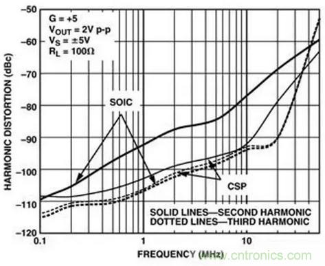 這種引腳排列還有一個(gè)好處就是降低了二次諧波失真。傳統(tǒng)運(yùn)算放大器的引腳配置中引起二次諧波失真的一個(gè)原因是同相輸入和負(fù)電源引腳之間的耦合作用。LFCSP封裝的低失真引腳排列消除了這種耦合所以大大地降低了二次諧波失真;在有些情況下最多可降低14dB。(圖十二)顯示了採用SOIC封裝和LFCSP封裝失真性能的差別。