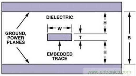 帶狀控制阻抗印制線(圖十四)採用了兩層接地平面,信號(hào)印制線夾在其中。這種方法使用了較多的印制線,需要的PCB層數(shù)更多,對(duì)電介質(zhì)厚度變化敏感,而且成本更高,所以通常只用于要求嚴(yán)格的應(yīng)用中。