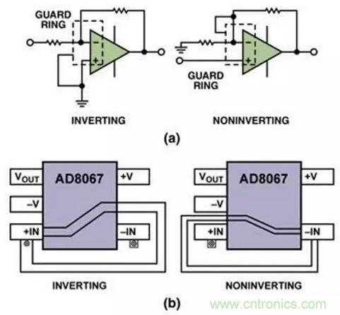 (公式七)保護(hù)環(huán),或者稱隔離環(huán),是運(yùn)算放大器常用的另一種遮罩方法,它用于防止寄生電流進(jìn)入敏感結(jié)點(diǎn)。其基本原理很簡單,用一條保護(hù)導(dǎo)線將敏感結(jié)點(diǎn)完全包圍起來,導(dǎo)線保持或者迫使它保持(低阻抗)與敏感結(jié)點(diǎn)相同的電勢,因此使吸收的寄生電流遠(yuǎn)離了敏感結(jié)點(diǎn)。(圖十五)(a)顯示了用于運(yùn)算放大器反相配置和同相配置中保護(hù)環(huán)的原理圖。圖十五(b)則顯示用于SOT-23-5封裝中兩種保護(hù)環(huán)的典型佈線方法。