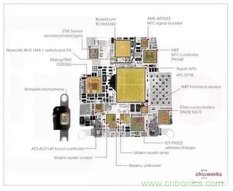 采用 SiP 技術的產品,最著名的非 Apple Watch 莫屬。因為 Watch 的內部空間太小,它無法采用傳統的技術,SoC 的設計成本又太高,SiP 成了首要之選。藉由 SiP 技術,不單可縮小體積,還可拉近各個 IC 間的距離,成為可行的折衷方案。下圖便是 Apple Watch 芯片的結構圖,可以看到相當多的 IC 包含在其中。