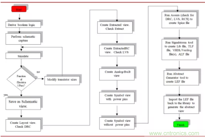 對于數字電路中的標準單元設計,是從布爾邏輯(Boolean logic)描述并定義單元的邏輯關系開始,接著是電路設計(schematic capture或circuit design)與電路仿真(circuit simulation),而后開始版圖設計。版圖設計需要符合制造工藝規則檢查(design rule check,DRC)和版圖電路一致性檢查(layout versus schematic,LVS)通過才算完成,這時,版圖設計的結果用“圖形顯示系統第二版”(graphic display system II,GDSII)文件記載,并作為芯片制造中制作掩模板(mask)的依據。數字電路的標準單元和I/O單元完成版圖設計后,還要做寄生參數(電阻R電容C)提取(parasitic extraction,RCX),供電路設計者作進一步擬合優化處理,這種反標方法(back-annotation)也是芯片級設計的重要步驟之一。圖2給出了比較完整的版圖設計全流程圖。