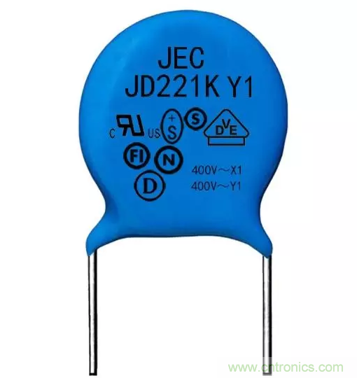 Y電容通常都是陶瓷類電容器,一般成隊出現(xiàn),多數(shù)是扁圓形外觀,顏色呈現(xiàn)藍色,能夠抑制共模干擾,Y電容容量是nF級。基于漏電流的制約,Y電容量不可很大。Y電容多數(shù)適用于隔離場合,按照IEC標準,Y1產(chǎn)品電氣間隙最小為8.0㎜,Y2產(chǎn)品電氣間隙不低于6.3㎜,作為隔離產(chǎn)品,安全距離要做夠,避免高壓通電發(fā)生拉弧現(xiàn)象。