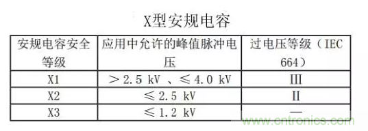 X型安規(guī)電容根據(jù)耐壓分為 X1、X2、X3三種,安規(guī)電容安全等級中允許的峰值脈沖電壓過電壓等級:2.5kV<X1≤4.0kV、X2≤2.5kV、X3≤1.2kV