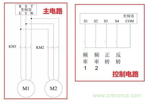 【導讀】變頻器一拖二控制兩個不同功能的電機肯定不行,因為它只有一組電源輸出,只能分別單獨來完成。也就是說變頻器可以驅動兩臺電機但只能運行其中的一臺,有什么辦法來實現呢?