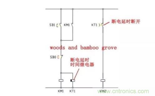2 ,停止時,按下停止按鈕SB0,交流接觸器KM1和斷電延時時間繼電器KT1斷電釋放,KT1的斷電延時斷開觸點經(jīng)過設定的時間后復位斷開。交流接觸器KM2斷電釋放。實現(xiàn)了交流接觸器KM1斷電釋放一段時間后,交流接觸器KM2才斷電釋放的控制要求。