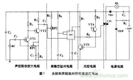 但從多年從事電子技術教學的經(jīng)驗中,我覺得識讀電子電路原理圖還是有一定方法可以遵循的,下面分享一些結合光控和聲控延時照明樓道燈電路(圖1)做的總結。