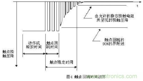回跳時間包括吸合回跳時間和釋放回跳時間。由于繼電器是采用有彈性的機械觸點完成線路的接通和斷開,因此不同于由半導(dǎo)體器件組成的無觸點電子開關(guān),當(dāng)繼電器的觸點接通或斷開的瞬間會有一段不穩(wěn)定的接觸期,典型的觸點波形見圖4。