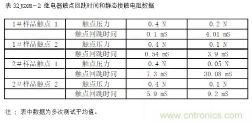 MIL-R-39016D和GJB 65A-91對觸點回跳做了定義:“等于或大于開路電壓的 90%,且脈沖寬度等于或大于 10 uS 的現(xiàn)象則認為是回跳”。同時明確規(guī)定觸點回跳時間不得超過 1.5 mS。有些用戶對回跳時間參數(shù)不以為然,認為觸點最終總會接通(或斷開),過程中有沒有回跳不影響繼電器的正常使用。這是一種錯誤的認識,軍標(biāo)之所以規(guī)定回跳時間參數(shù)的測試,是因為繼電器的回跳時間同靜態(tài)接觸電阻參數(shù)一樣,反映了繼電器的觸點壓力,試驗證明,當(dāng)繼電器的觸點壓力明顯衰退時,回跳時間會變長。表3顯示了繼電器樣品在試驗中觸點回跳時間和觸點壓力之間的關(guān)系。