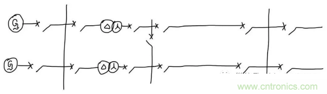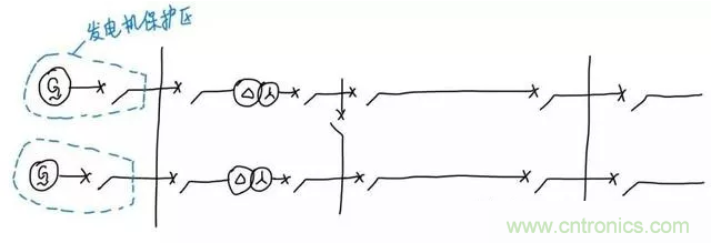 發(fā)電機(jī)接到低壓母線,再通過升壓變壓器把電壓升高(比如說升高成220kV),經(jīng)過輸電線路輸送到220kV變電站。這里就需要發(fā)電機(jī)保護(hù)、變壓器保護(hù)、母線保護(hù)和線路保護(hù)。對于發(fā)電機(jī)保護(hù),我們希望發(fā)電機(jī)故障時(shí)只切除故障的發(fā)電機(jī),不影響非故障設(shè)備正常運(yùn)行,而只切除發(fā)電機(jī)出口斷路器就可以實(shí)現(xiàn)只停故障發(fā)電機(jī)的目標(biāo),所以我們把保護(hù)區(qū)的邊界劃到了發(fā)電機(jī)出口斷路器旁邊的電流互感器,如下圖: