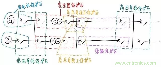 我們發(fā)現(xiàn)不同元件的保護(hù)區(qū)之間有重疊的部分。為了保證任何地方發(fā)生故障都在保護(hù)區(qū)內(nèi),這樣的重疊是必要的。如果沒有重疊區(qū),會導(dǎo)致保護(hù)出現(xiàn)盲區(qū),造成保護(hù)無法正確切除故障元件。但是我們希望重疊區(qū)盡可能小,因?yàn)橹丿B區(qū)內(nèi)的故障會造成兩個(gè)保護(hù)區(qū)內(nèi)所有的開關(guān)跳閘,擴(kuò)大停電范圍。