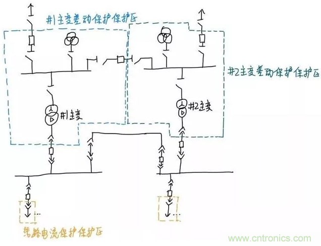 同理,對于后面的升壓變壓器,斷開變壓器兩側(cè)的斷路器可以實(shí)現(xiàn)切除變壓器而不切除其它元件,所以保護(hù)范圍就是變壓器兩側(cè)斷路器旁邊的電流互感器圍成的范圍。