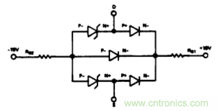 圖4舉例說明了通過在電源供電引腳串聯(lián)二極管(比如1N459)防止寄生晶體管導(dǎo)通的方法。如果S端或D端電壓高于電源電壓時,CR1和/或CR2反向偏置,基極驅(qū)動電路不能使晶體管導(dǎo)通。每個CMOS器件都應(yīng)該有一對獨(dú)立的二極管對其進(jìn)行保護(hù)。盡管這個方法很有效,但它不是萬無一失的。如果開關(guān)的一端連接到一個負(fù)電位(例如一個充電電容),并且另一端電壓超過VDD,則盡管有保護(hù)二極管。