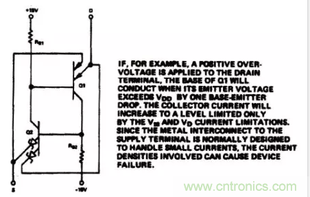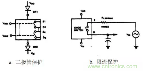 過壓能引起過大的電流和金屬化問題。通常,運(yùn)算放大器的輸出作為S端或D端的電壓源,因此電流不能大于運(yùn)算放大器直流輸出電流的限值。然而,瞬態(tài)感應(yīng)電流仍有可能破壞CMOS器件;因此,有必要進(jìn)行保護(hù)。